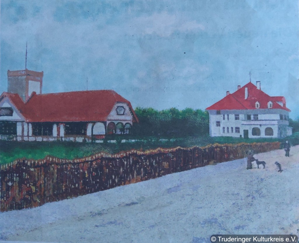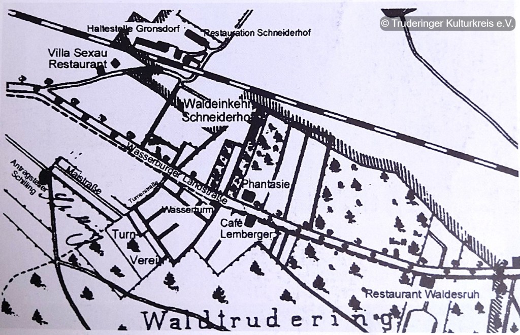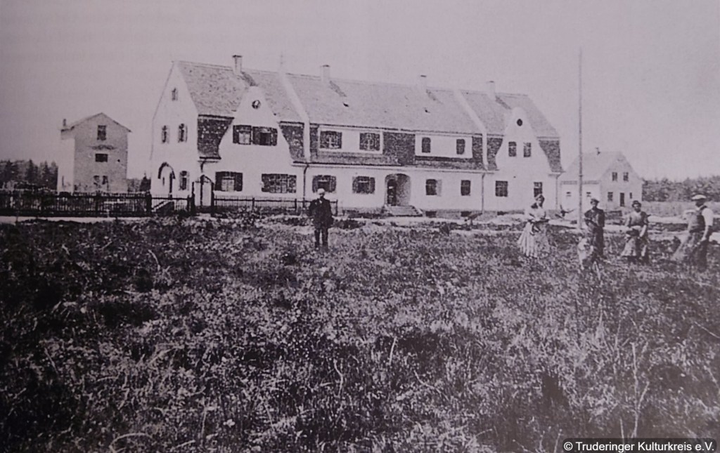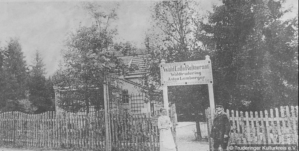 1905: eines der ersten Häuser, die in Stein gebaut wurden – die Wirtschaft “Fantasie/Phantasie”. Grundstück wurde 1903 parzelliert. Mit Schlachthaus (wo heute Edeka steht), Biergarten (der bis zur Adlerstraße ging), Kegelbahn, Rodelbahn für Sommer und Winter, etc. Im Sommer fand hier jeden Sonntag ein Volksfest mit Musik, Tanz, Schieß- und Schaubuden statt. Bei Münchner Radvereinen war die Waldwirtschaft ein beliebtes Ziel ihrer Fahrten. 1964 abgerissen, auf dem ehemaligen Gaststätten Areal entstand die von Ernst Maria Lang geplante “Phantasiesiedlung” mit dem Waldtruderinger “Hochhaus” (Wasserburger Landstraße 211) bis zu Adlerstraße: